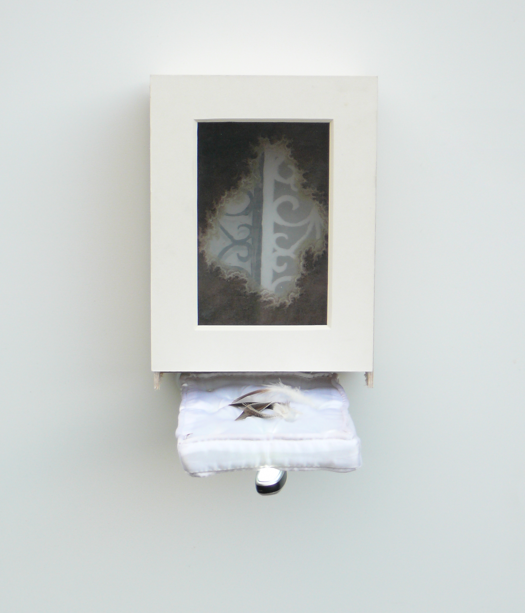 Mixed Media: Serigraph, Laser Print Transparency, Wood, Mat, Tar Gel, Feathers, Doll Bed, Light.